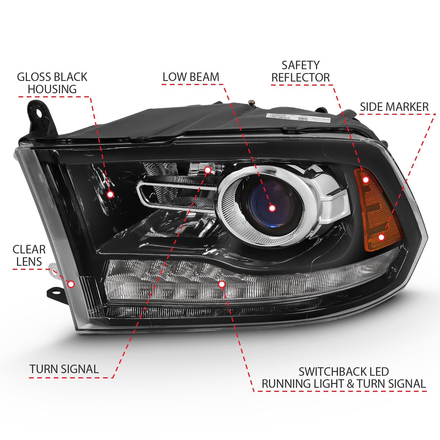 2018 | Ram | 1500 | ST Crew Cab Pickup 4-Door | 5.7L 345Cu. In. V8 GAS OHV Naturally Aspirated | Amber Lens; Black Housing; Pair; w/Plank Style Switchback, For OE Projector and OE Non-Projector |