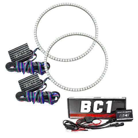 The ColorSHIFT Halo Kit can produce any color including whites from 3000K-15000K with the push of a button. This allows the user to dial-in the exact color rings that they desire. These 3-Chip 5050 SMD rings are BRIGHT, and for some they may be too bright, that is why (for the first time) the user has full control over the ring brightness. ORACLE SMD or "Surface Mount Diode" Halos utilize an advanced type of LED chip that can produce brilliant light output while only consuming a small amount of power. The SMD chips are installed onto a CAD designed 6-layer PCB (Printed Circuit Board) which is very sturdy and will not break if pressured. The PCB can easily be mounted to a headlight housing using the pre-installed 3M adhesive tape backing. The new BC1 ColorSHIFT controller is a robust and rugged Bluetooth option that is easy to install and a low price. Perfect for adding ORACLE ColorSHIFT products to your vehicle, simply connect power and ground then connect your smartphone through the free app to control. The controller features 4 outputs with waterproof connections for easy wiring to your ColorSHIFT lighting products. Through the app you can turn your lights on and off, select from millions of color variations, control patterns, brightness, strobe function, and even control the lights with music