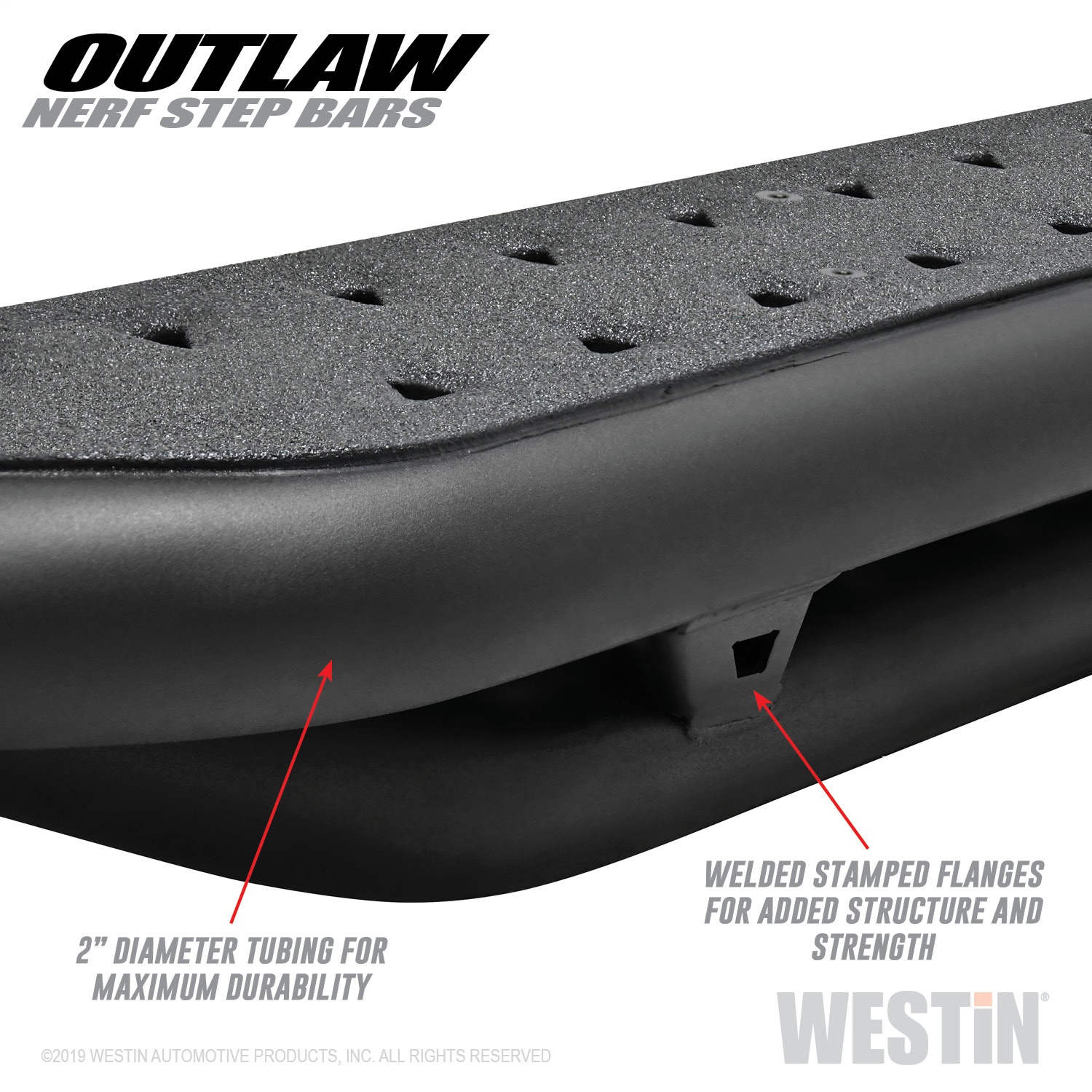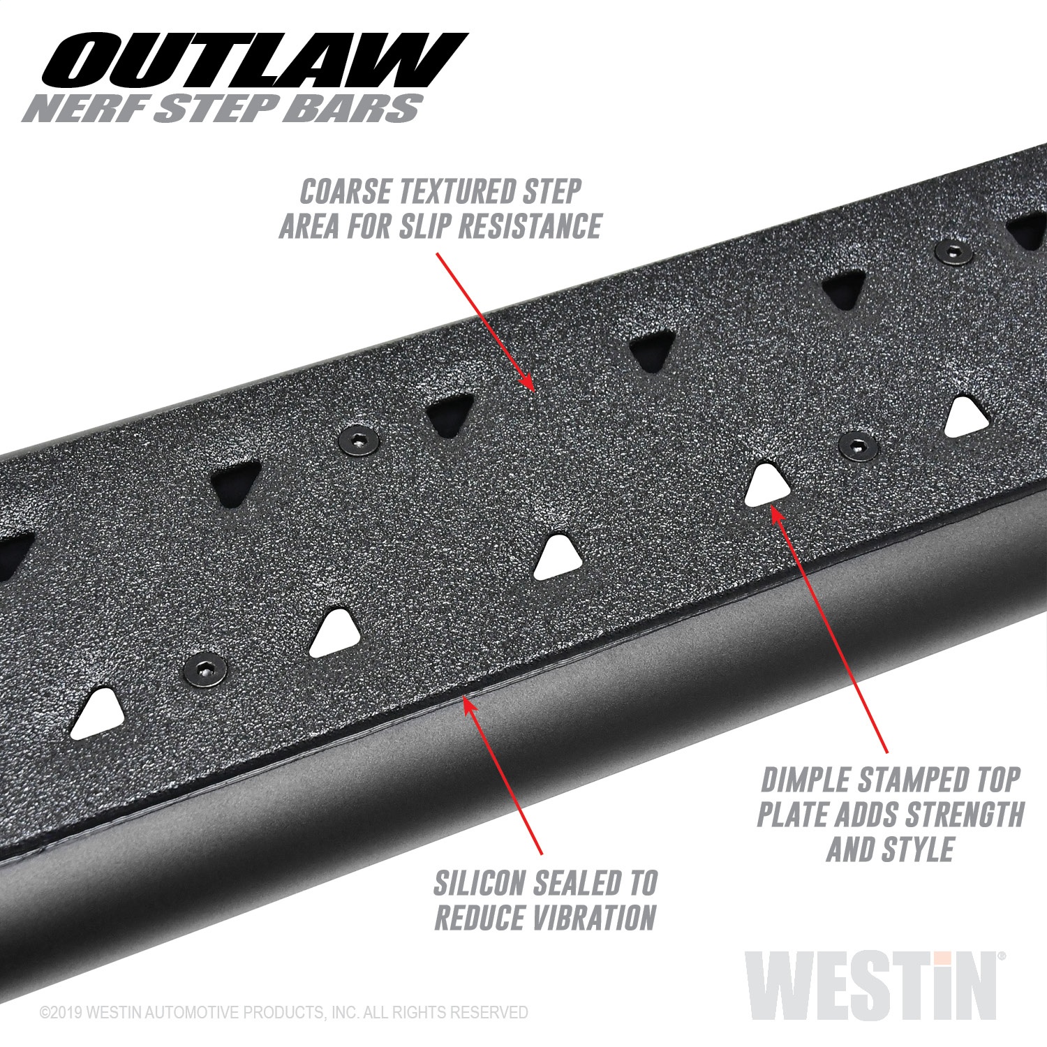 Westins Outlaw Nerf Step Bars offer the perfect balance between function and strength resulting in the ultimate rugged look designed to last and impress. Engineered to fit tightly against rocker panels, the Outlaw Nerf Step Bars provide a solid fit and superb protection while simultaneously improving vehicle cab access. Whether you are an avid overlander or simply an off-roader, rest assured you will be safely stepping into your vehicle with a 16 gauge steel coarse step surface and 2 in. diameter tubing. Featuring bolt-on installation, an e-coated base coat and textured black powder coat top finish, Westins Outlaw Nerf Step Bars are the ideal match for the toughest of conditions.