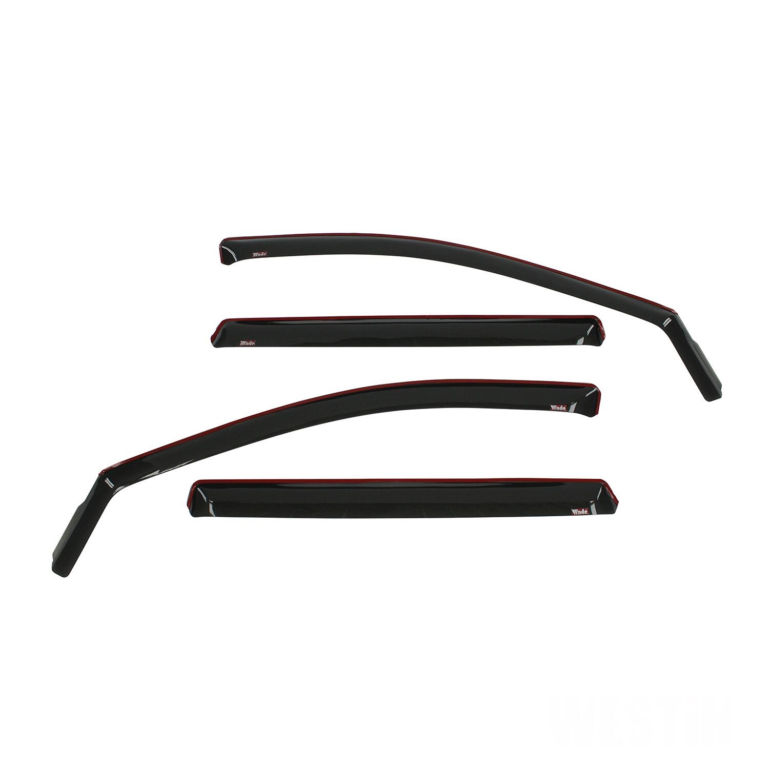 Wade In-Channel Wind Deflectors are a quick and quality solution to reducing wind, noise, heat, and glare without compromising the entry of fresh air when windows are rolled down slightly. They are easily installed by inserting the flanged edge into the directly window channel and secured with 3M automotive grade tape. Wade Wind Deflectors promote the circulation of fresh air while minimizing its volume and strength as it re-directs it up and into, or out of the vehicle. Their sleek design deflects wind and noise from entering the vehicle for a more pleasant ride any time of year. They are made from high-gloss smoke acrylic, and have transparency, so, visibility is never obstructed.